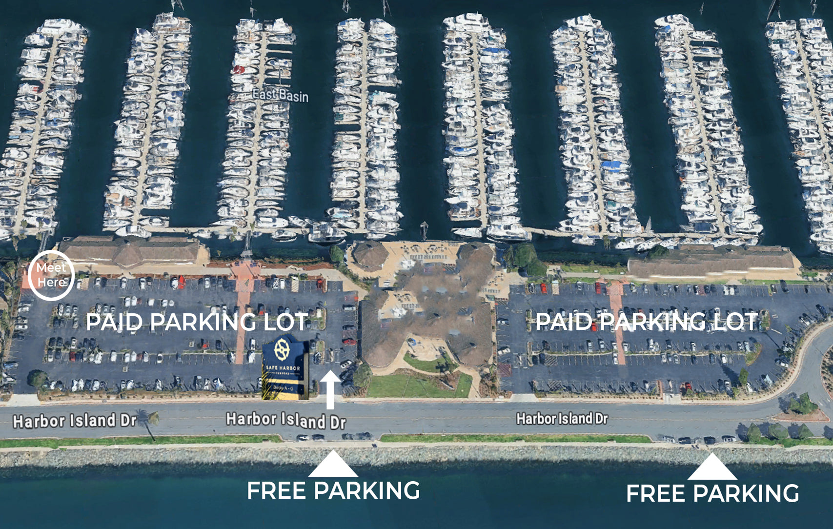 If you can't find a free spot, use the paid lot. The parking lots are marked with signs reading: "Safe Harbor Sunroad Docks A-G" as well as "the parking lot is managed by LAZ Parking."